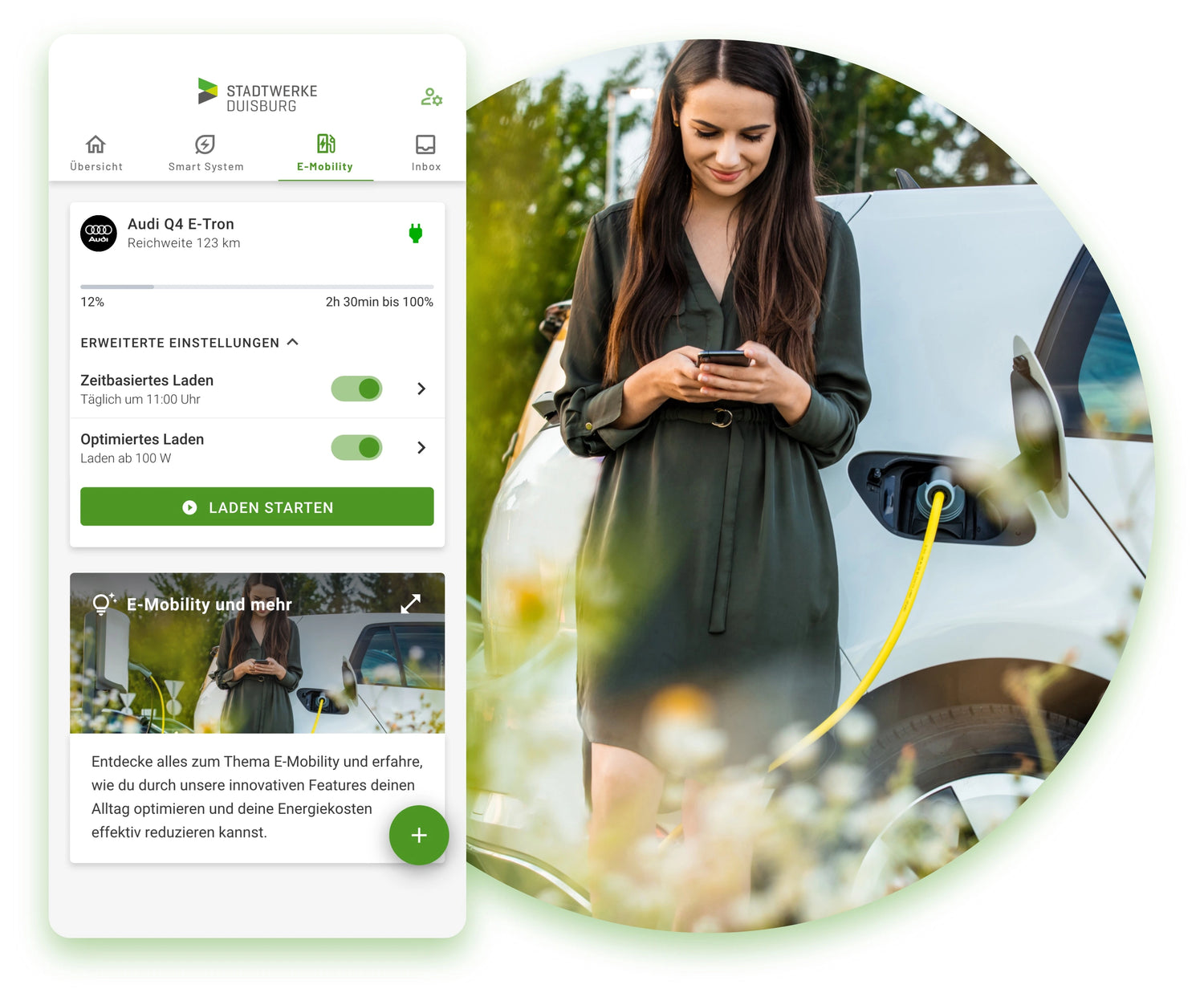 Unsere Lösung ist mit über 300 Elektroautos kompatibel und in der Stadtwerke Duisburg App inklusive.